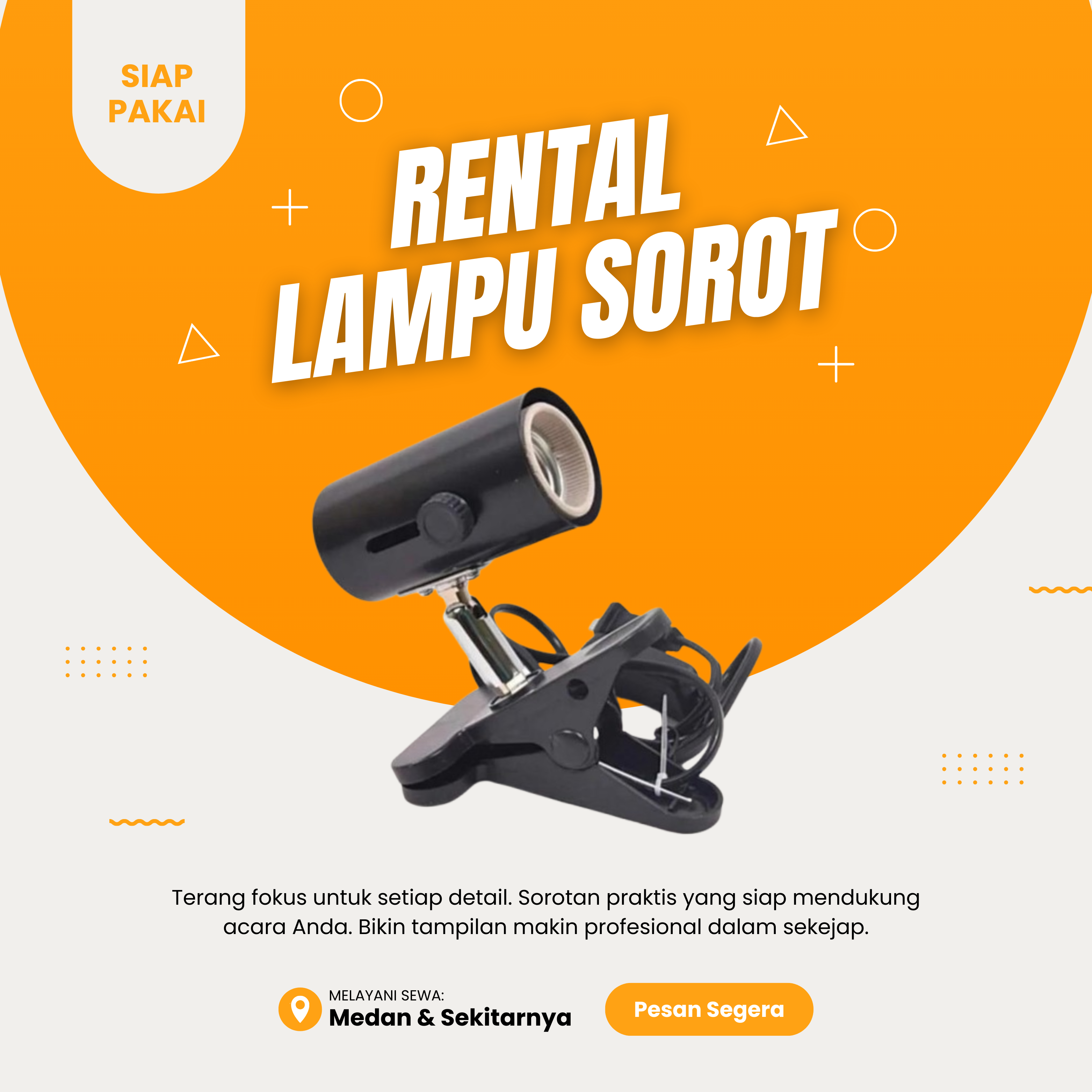 Kami menyediakan layanan sewa lampu sorot jepit 7W warm white untuk kebutuhan pencahayaan event seperti seminar, wedding, pameran, booth UMKM, dekorasi ruangan, hingga pemotretan produk. Cahaya warm white memberikan kesan elegan, terang, dan nyaman di mata, sangat cocok untuk berbagai suasana acara.